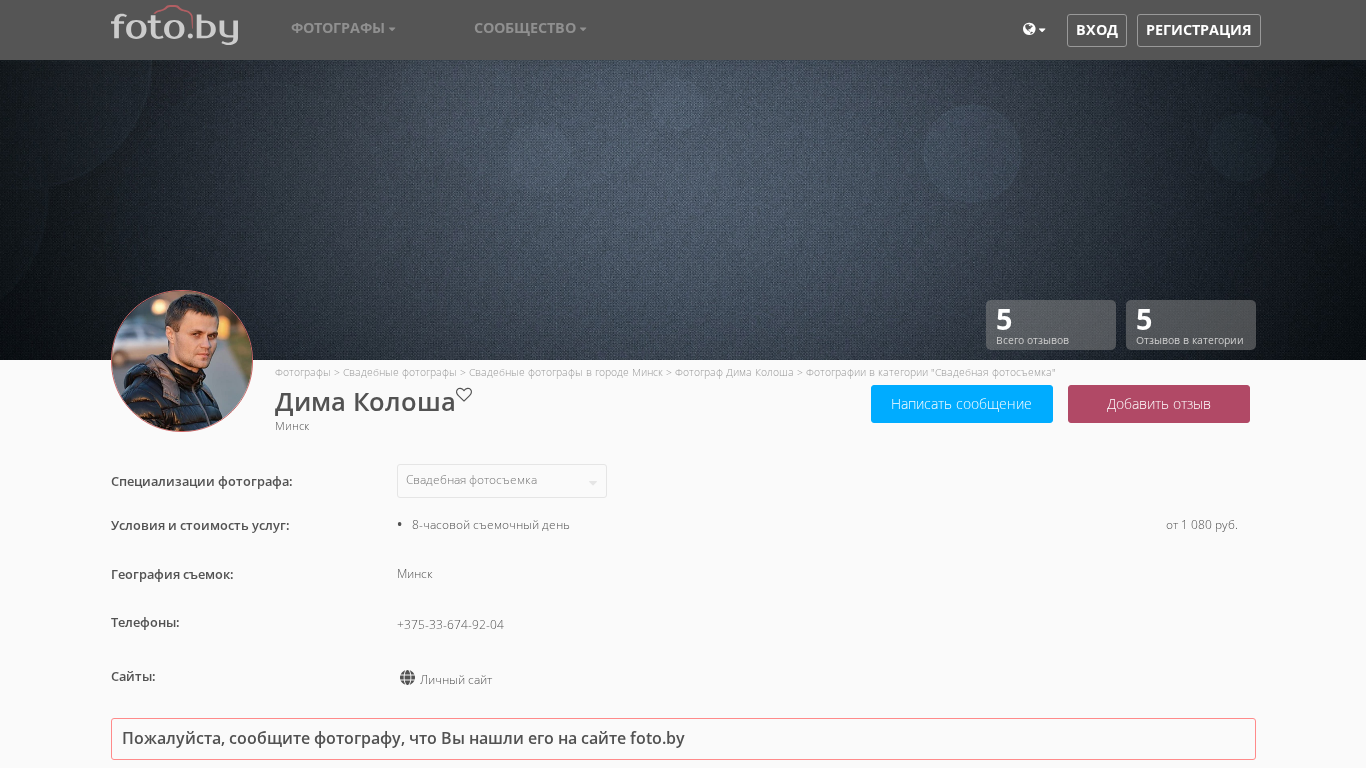 | SEO-описание | Фотографии в категории "Свадебная фотосъемка". Фотограф Дима Колоша - выполняю следующие виды фотосъемок: love story, свадебная фотосъемка. Работаю в городах: Минск |