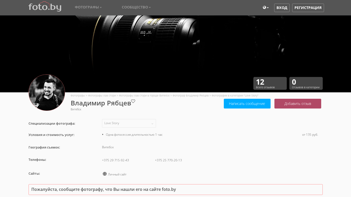 | SEO-описание | Фотографии в категории "Love Story". Фотограф Владимир Рябцев - выполняю следующие виды фотосъемок: свадебная фотосъемка, семейная фотосъемкапортретная фотосъемка,студийная фотосъемка . Работаю в городах: Витебск |