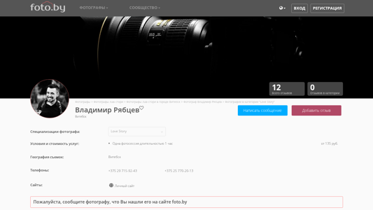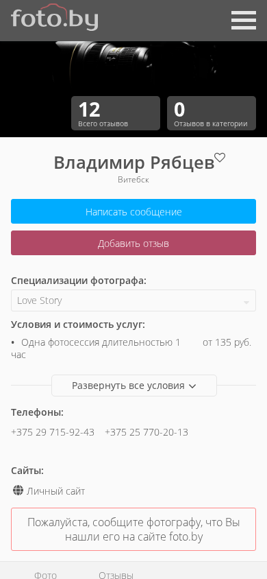 | AI-анализ | The website is a photography portfolio for Vladimir Riabcev, a photographer based in Vitsebsk, Belarus. The main page displays a catalog of photographers, with Riabcev's profile featured under the "Love Story" category. He specializes in various types of photo shoots including wedding, family, portrait, and studio photography. The geographical scope of his work is limited to Vitsebsk. Keywords associated with the website include "love," "story," "фотографии," "фотографы," and "витебск." The website also includes a community section for reviews and customer feedback. |