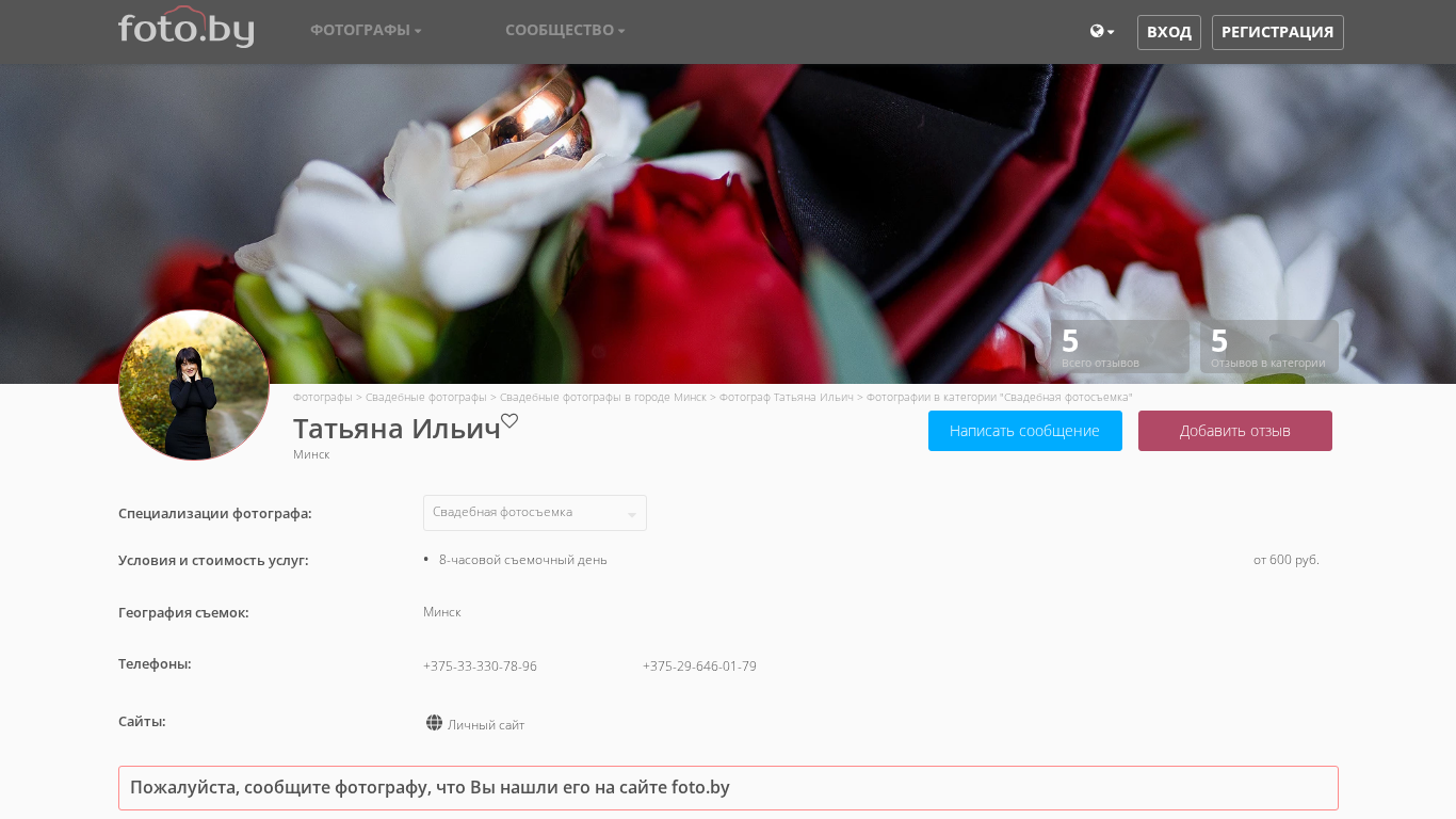 | SEO-описание | Фотографии в категории "Свадебная фотосъемка". Сайт фотографа ТАТЬЯНА ИЛЬИЧ. Я работаю как свадебный фотограф в городах Минск,Солигорск,Пинск,Гомель,Мозырь |