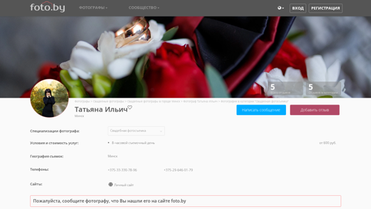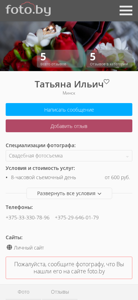| AI-анализ | This website belongs to photographer Tatiana Ilyich based in Minsk, Belarus. The main focus of the site is showcasing her work in the "Wedding Photography" category. The photographer offers her services in various cities including Minsk, Soligorsk, Pinsk, Homel, and Mozir. The site includes a catalog of photographers, community for photographers, and a blog. The most visited pages on the site include the catalog of photographers, community of photographers, and a blog. The site receives approximately 5 reviews, all in the wedding photography category. The photographer's specialization is in wedding photography and her pricing starts from 600 rub for an 8-hour shooting day. The site also includes contact information for the photographer, including phone numbers and websites. |
