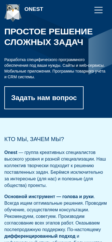 language: ru The web project onest.by offers custom software development services including websites, web services, and mobile applications. They also provide solutions for inventory management and CRM systems. To inquire, please submit your name and email, along with the topic of your question. Onest is a team of creative professionals with a strong focus on innovative and beneficial projects. Their approach is thorough and detailed, ensuring quality results. Their offerings include CRM systems for client database management, uptake analysis, service control, and statistical analysis. These systems streamline processes, increase data processing speeds, and provide valuable statistical information for various business types. They also offer CMS systems for content management on custom-built websites.