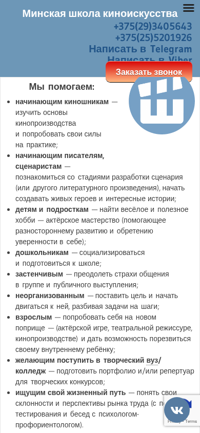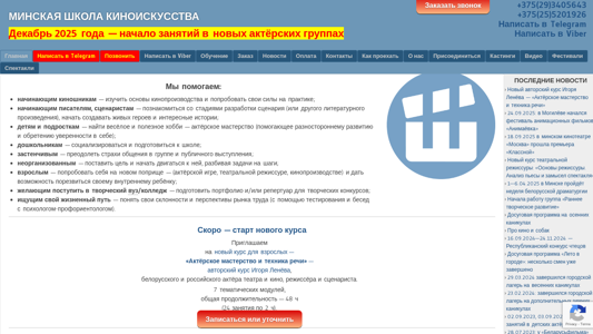 | AI-анализ | description: The Minsk Cinema School offers various courses in the field of cinema, including acting for children and adults, as well as preparation for admission to creative universities in Belarus and Russia. The school also provides training in directing, film production, sound recording, computer music, vocals, dance, comedy, and scriptwriting. The website contains information about the organization, its logo, and links to social media profiles. It is optimized for search engines and allows users to search for content on the site using a search bar. The site also features a fluid-width video player for multimedia content. The top keywords for the website include 'act', 'курсы', 'рское', 'мастерство', 'обучение', 'подростков', 'подать', 'заявку', 'рского', 'мастерства', 'детей', 'кино', 'вконтакте |