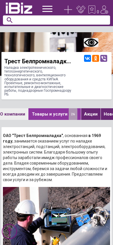 | AI-анализ | The online resource "Trest Belpromnaladka OAO" is a company based in Minsk, Belarus, specializing in the installation, commissioning, and maintenance of various types of electrical, thermal energy, technological, ventilation equipment, and control and measurement instruments (КИПиА). The company offers project design, repair, installation, testing, and diagnostic services, all subject to oversight by the Belarusian Gospromnadzor. The company's address is 220013, Hmel'nytskoho St., 8, in Minsk. The website includes sections for company information, products and services, and announcements for new job opportunities, as well as a section for customer reviews and contacts. The company was founded in 1969 and has since gained a reputation as a professional provider of these services. With modern |