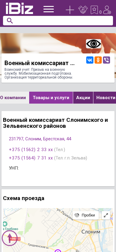 | Название / Заголовок | Военный комиссариат Слонимского и Зельвенского районов - Воинский учет. Призыв на военную службу. Мобилизационная подготовка. Организация территориальной обороны.. 231797, Слоним, , Брестская, 44 |