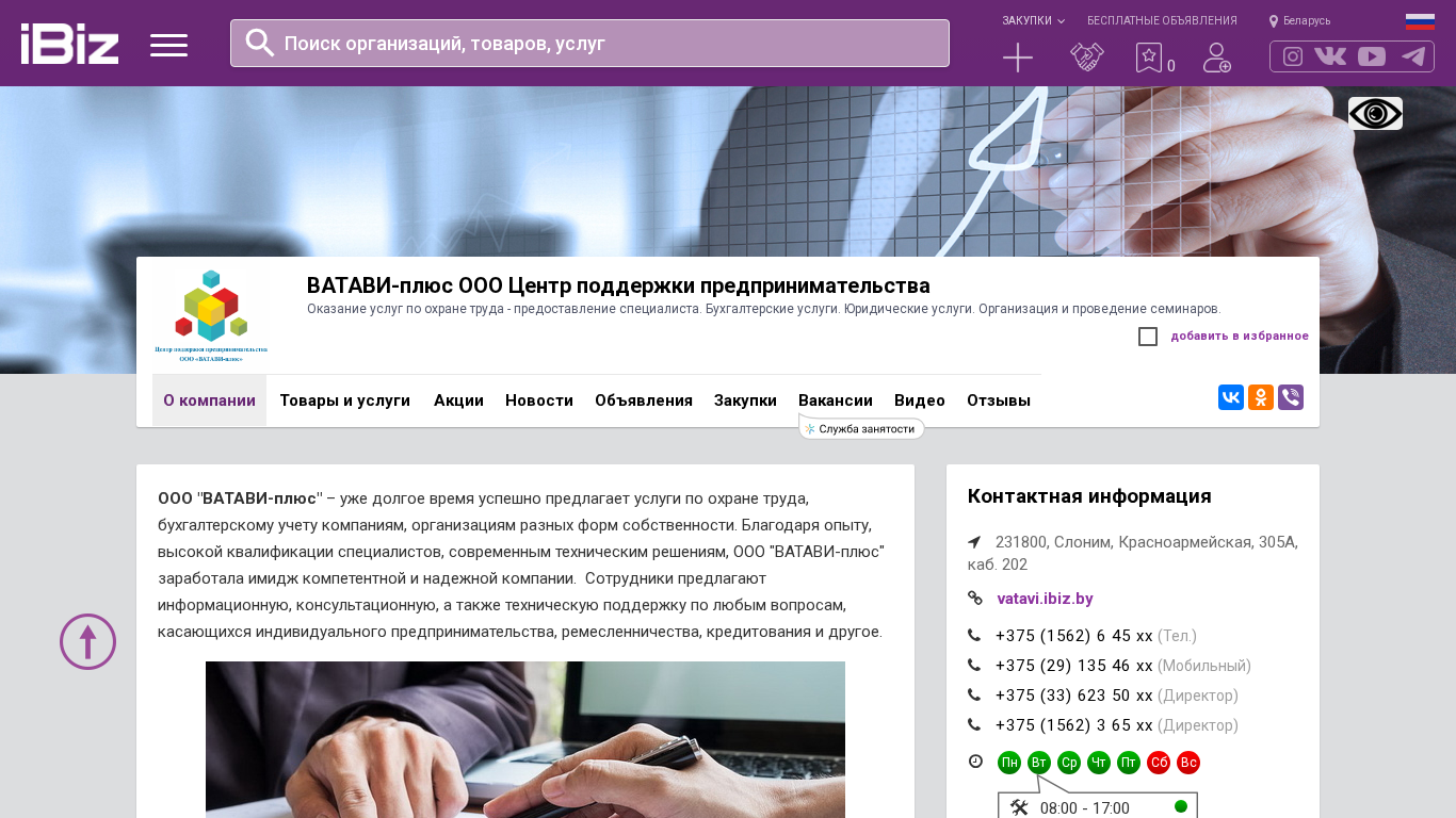 Название / ЗаголовокВАТАВИ-плюс ООО Центр поддержки предпринимательства - Оказание услуг по охране труда - предоставление специалиста. Бухгалтерские услуги. Юридические услуги. Организация и проведение семинаров.. 231800, Слоним, , Красноармейская, 305А, каб. 202