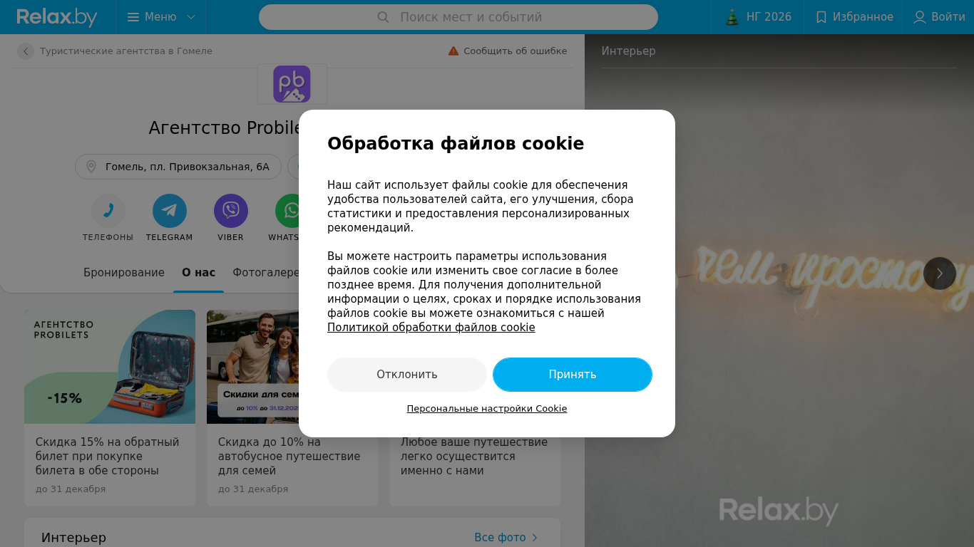 | SEO-описание | Сервис бронирования путешествий Probilets (Пробилетс) в Гомеле – отзывы, телефоны, график работы и карта проезда на Relax.by |