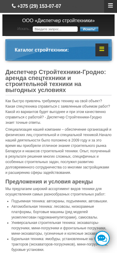 | SEO-описание | Аренда строительной и спецтехники в Гродно ▶️ Большой парк техники. Оперативная доставка на объект. Низкие цены. Любой срок. Скидки при долгосрочной аренде ☎️ +375 29 153-07-07 |