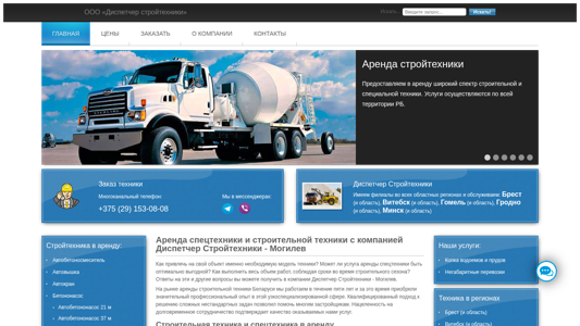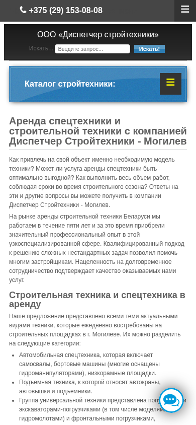 | SEO-описание | Аренда строительной и спецтехники в Могилеве и области ▶️ Низкие цены. Любой срок. Скидки при долгосрочной аренде. Большой парк. Доставка на объект ☎️ +375 29 153-08-08 |