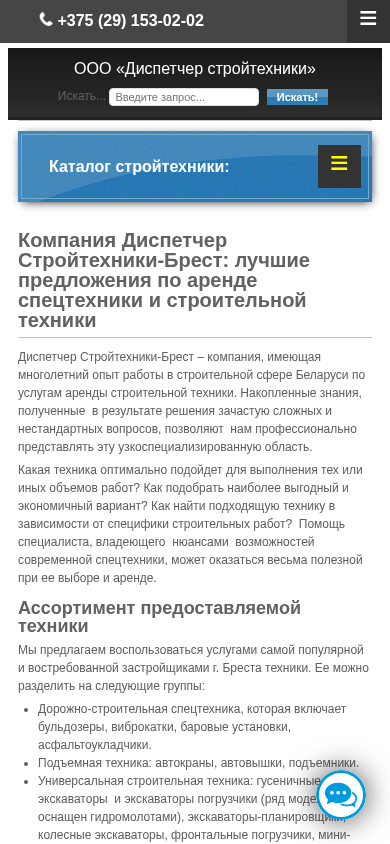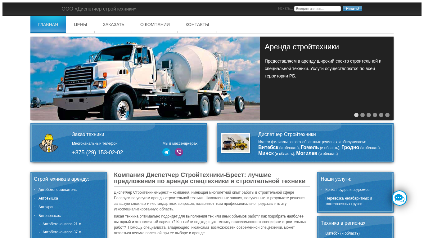| SEO-описание | Аренда строительной и спецтехники в Бресте ▶️ Большой парк. Оперативная доставка на объект. Низкие цены. Любой срок. Скидки при долгосрочной аренде ☎️ +375 29 153-02-02 |