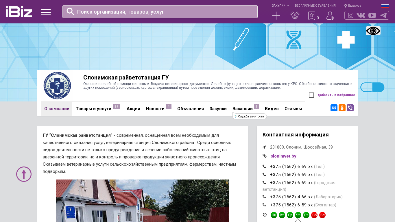 | AI-анализ | The web project "Sloнимская райветстанция ГУ" is a modern veterinary station in Sloним, Belarus, providing veterinary services for animals and birds within its jurisdiction. It also carries out control and verification of animal-derived products. The station offers veterinary services to agricultural enterprises, farms, and private households. The station's facilities include Sloнимская городская ветеринарная станция, Sloнимская районная ветеринарная лаборатория, Sloнимская лаборатория ветеринарно-санитарной экспертизы №1, Sloнимская лаборатория ветеринарно-санитарной экспертизы №2, and Жировичская участковая ветеринарная лечебница. The station conducts and organizes therapeutic and preventive measures, ensures |