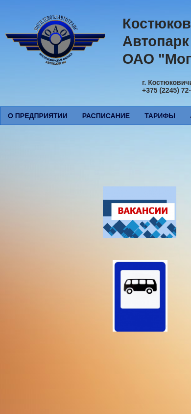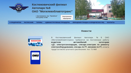 | AI-анализ | This online resource is a website for the Kostюcoвичский филиал (Kostуcoвичский филиал in English) of OAO (Open Joint Stock Company) Могилевоблавтотранс (Mogilevoblavtotrans), specifically the Autopark №8 branch located in the town of Костюковичи (Kostyukovichi) in Могилевская область (Mogilev region), Belarus. The website provides information on the structure of the organization, its normative and legal documents, and various procedures for citizens and legal entities to apply for services, file complaints, and contact the company. There is a section for news and job openings, including the need for drivers, electric welder, mechanic, and electrician for repairs, with contact information provided. The website also includes a schedule for personal meetings with |