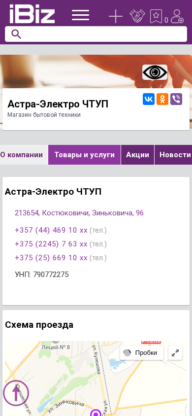 | Название / Заголовок | Астра-Электро ЧТУП - Магазин бытовой техники. 213654, Костюковичи, , Зиньковича, 96 |