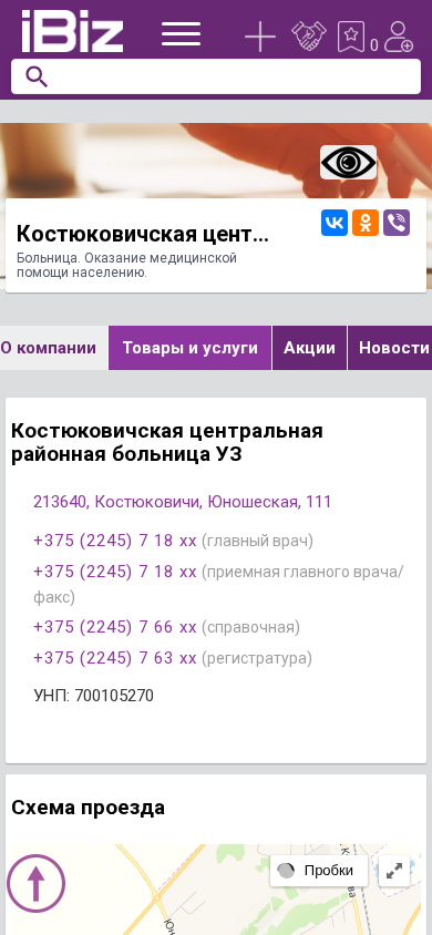 | AI-анализ | The web project "Костюковичская центральная районная больница УЗ - Больница" is a healthcare institution located at Юношеская 111, Костюковичи, 213640, Belarus. The website provides information on the hospital's services, contact details, and a map for visitors. The title of the webpage translates to "Kostyukovich Central District Hospital - Hospital. Providing medical assistance to the population." The top keywords associated with the website include "services" (14 occurrences), "free" (14 occurrences), "2245" (8 occurrences), "hospital" (5 occurrences), and "purchases" (5 occurrences). The website also features sections for news, vacancies, and patient reviews. The hospital's contact information includes |