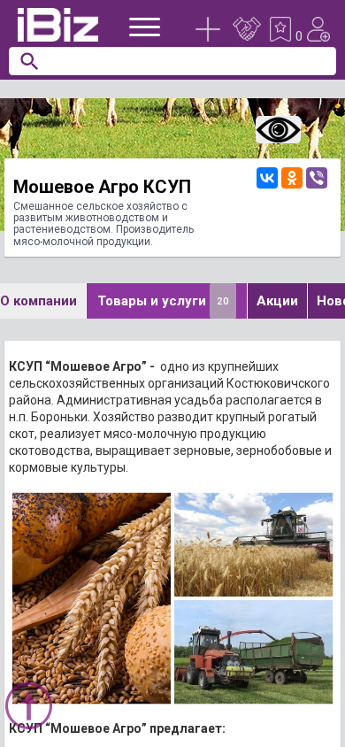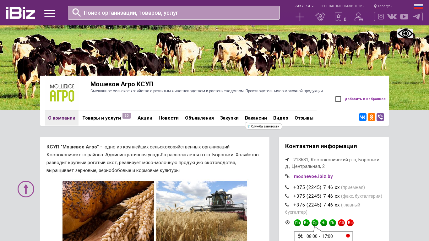 | AI-анализ | The web project "Мошевое Агro КСУП" is a farming enterprise specializing in mixed agriculture with a focus on developed livestock and crop farming. The producer of meat and dairy products, located in Belarus, Costyukovich District, Boronki village, Central Street, No. 2. The farm raises cattle, sells meat and dairy products from cattle farming, grows cereals, legumes, and fodder crops. The farm offers: Grain; Rapeseed; Livestock production products; Milk. The livestock sector is the main source of revenue for the farm. The farm has cattle breeding farms, dairy farms, field brigades, labor-intensive process brigades, and supporting and auxiliary productions: repair shop, mechanical yard, auto park, and store. We guarantee high quality agricultural products and competitive prices. We welcome |