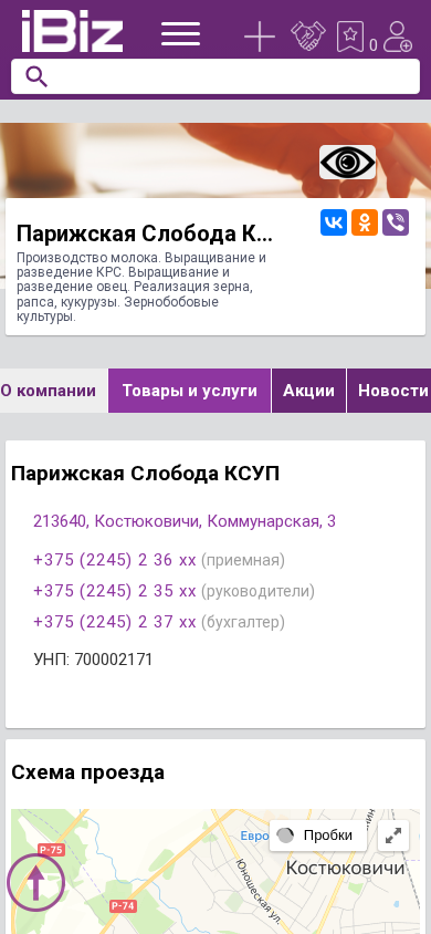 | Название / Заголовок | Парижская Слобода КСУП - Производство молока. Выращивание и разведение КРС. Выращивание и разведение овец. Реализация зерна, рапса, кукурузы. Зернобобовые культуры. . 213640, Костюковичи, , Коммунарская, 3 |