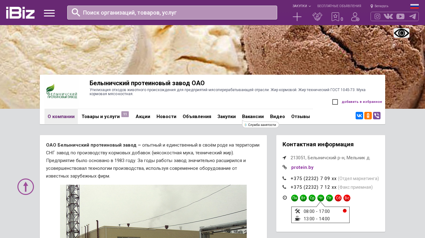 | Название / Заголовок | Белыничский протеиновый завод ОАО - Утилизация отходов животного происхождения для предприятий мясоперерабатывающей отрасли. Жир кормовой. Жир технический ГОСТ 1045-73. Мука кормовая мясо-костная. . 213051, , Мельник д. |