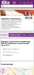 | Название / Заголовок | Дорожно-строительное управление ОАО № 18 Дорожно-строительный трест № 6 - Комплекс ремонтно-строительных работ, выполнение грузоперевозок и оказание услуг дорожно-строительными машинами. Реализация строительных материалов собственного производства: асфальтобетонные смеси, бетонные смеси, строительные растворы, песок.. 230026, Гродно, , Победы, 15 |