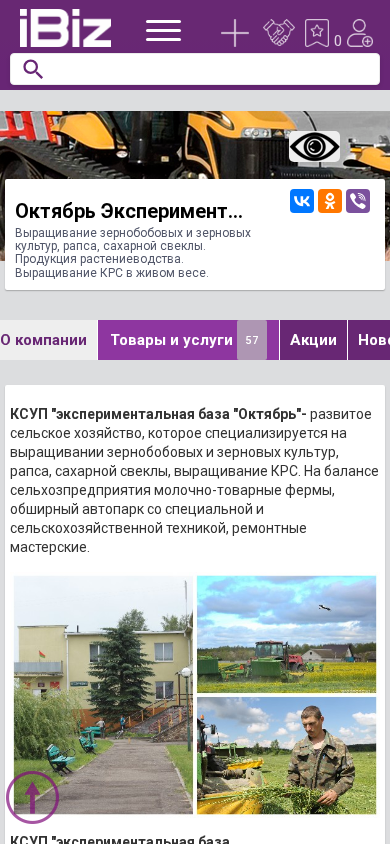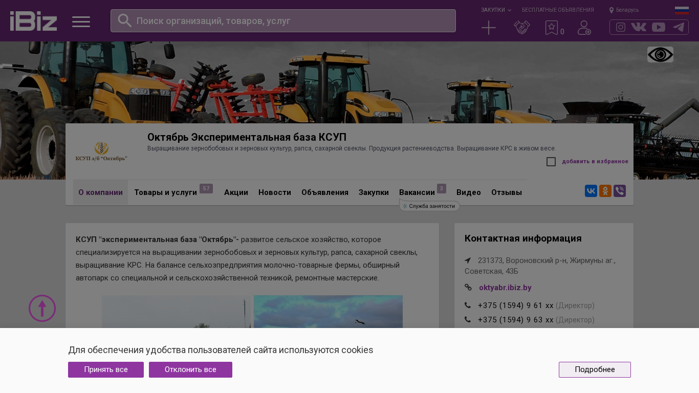 | Название / Заголовок | Октябрь Экспериментальная база КСУП - Выращивание зернобобовых и зерновых культур, рапса, сахарной свеклы. Продукция растениеводства. Выращивание КРС в живом весе.. 231373, , Жирмуны аг., Советская, 43Б |