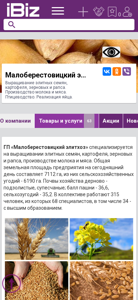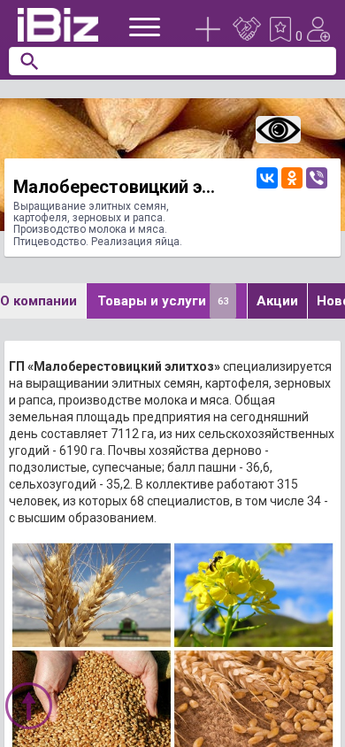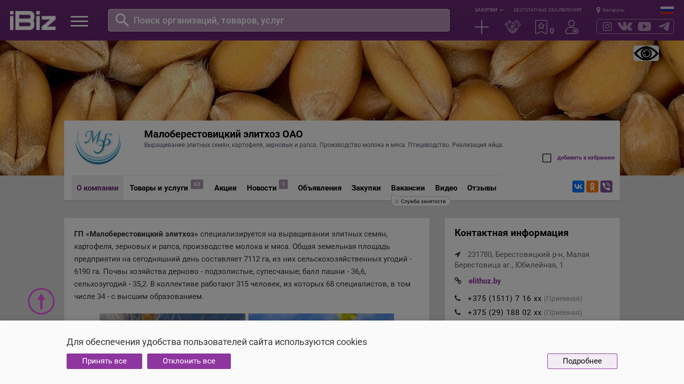 | AI-анализ | --- The website is for Малоберестовицкий элитхоз OAO, an agricultural company specializing in the cultivation of elite seeds, potatoes, grains, and rapeseed. They also produce milk, meat, and eggs. The company's address is in Малая Берестовица аг., Юбилейная, 1. The website provides information on the company's offerings, including seeds, potatoes, grains, milk, meat, and eggs for sale. The company covers an area of 7112 ha, with 6190 ha dedicated to agricultural land. The soil consists of derno-podzolic and supeccious types, with a land quality score of 36.6 for pasture and 35.2 for agricultural land. The workforce includes 315 people, including 68 |