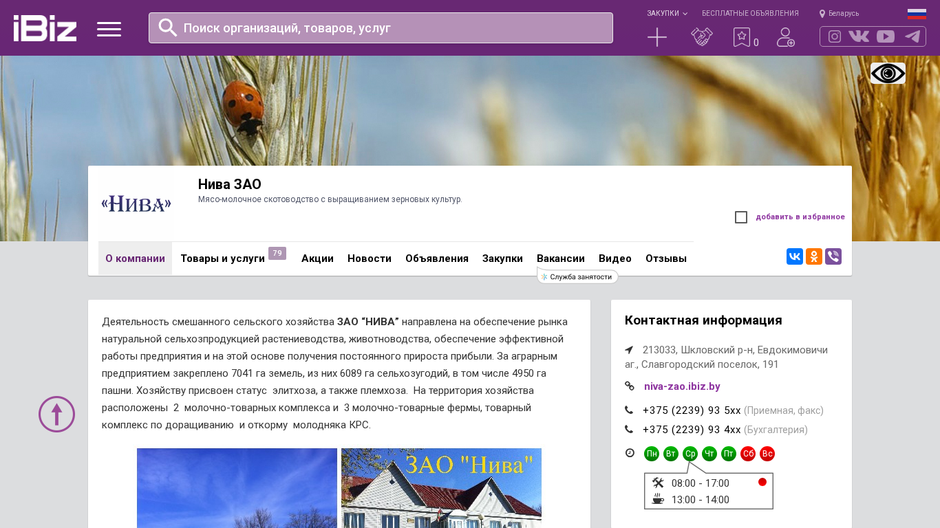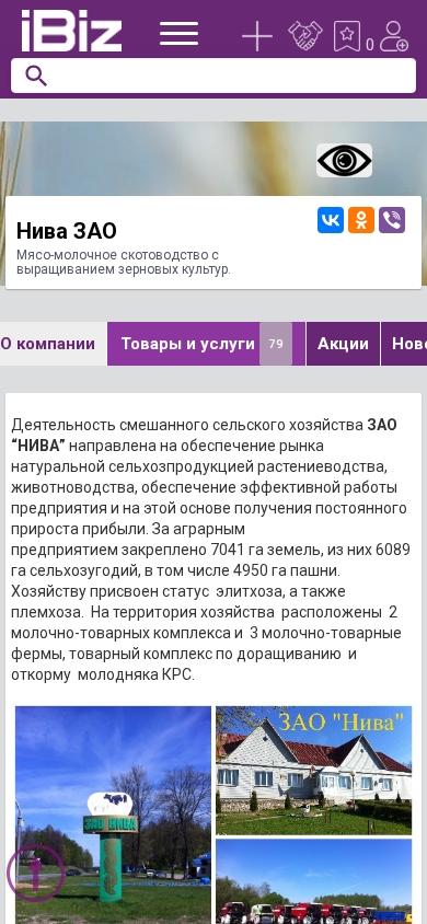 | AI-анализ | This website is for Niva ZAO, a farming business specializing in meat-dairy cattle farming and growing cereal crops. The company is located in the village of Yevdokimovichi, Slavgorodsky settlement, 191, in Minsk region, Belarus. The website includes a map for directions, contact telephone numbers, and the company's address. The main activities of Niva ZAO include livestock and crop production, with 7041 hectares of land, 6089 hectares of which are agricultural lands, including 4950 hectares of pasture. The farm has an elite and breeding farm status, and features two dairy cattle complexes and three dairy cattle farms, as well as a livestock rearing and fattening complex for cattle. The farm's production focuses on |