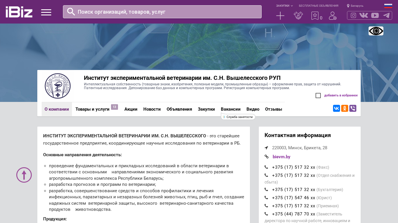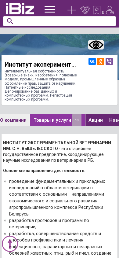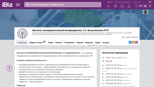 | AI-анализ | This website is the official page of the State Experimental Veterinary Institute named after S.N. Vysheleskiy RUP, which deals with intellectual property (trademarks, inventions, useful models, industrial samples) – registration, protection, and patent research. Also, it offers database deposits and computer program registration. The address and contact information is provided, including in the section of free classified ads. The company was established as the oldest state enterprise coordinating veterinary research in Belarus. Its main activities include conducting fundamental and applied research in veterinary science in accordance with the key directions of economic and social development of the agro-industrial complex of the Republic of Belarus; developing forecasts and programs in veterinary science; and creating reliable veterinary protection and high veterinary-sanitary quality of livestock products. The products offered include antirabic vaccines for immunization of farm animals |