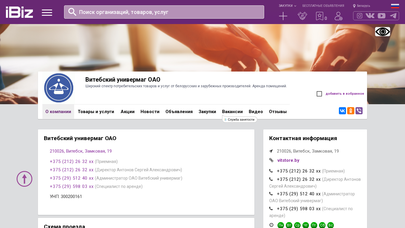 | Название / Заголовок | Витебский универмаг ОАО - Широкий спектр потребительских товаров и услуг от белорусских и зарубежных производителей. Аренда помещений.. 210026, Витебск, , Замковая, 19 |