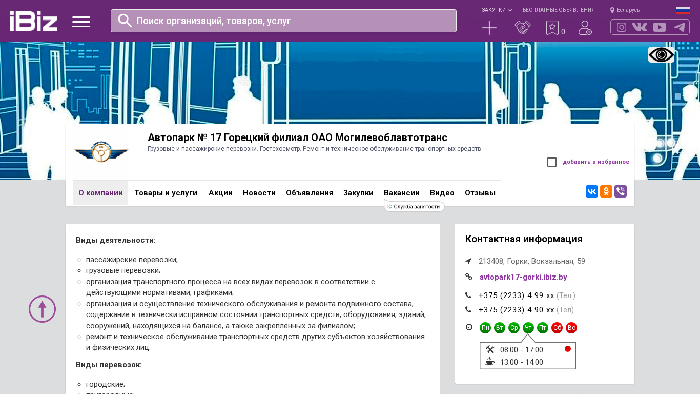 | Название / Заголовок | Автопарк № 17 Горецкий филиал ОАО Могилевоблавтотранс - Грузовые и пассажирские перевозки. Гостехосмотр. Ремонт и техническое обслуживание транспортных средств.. 213408, Горки, , Вокзальная, 59 |
