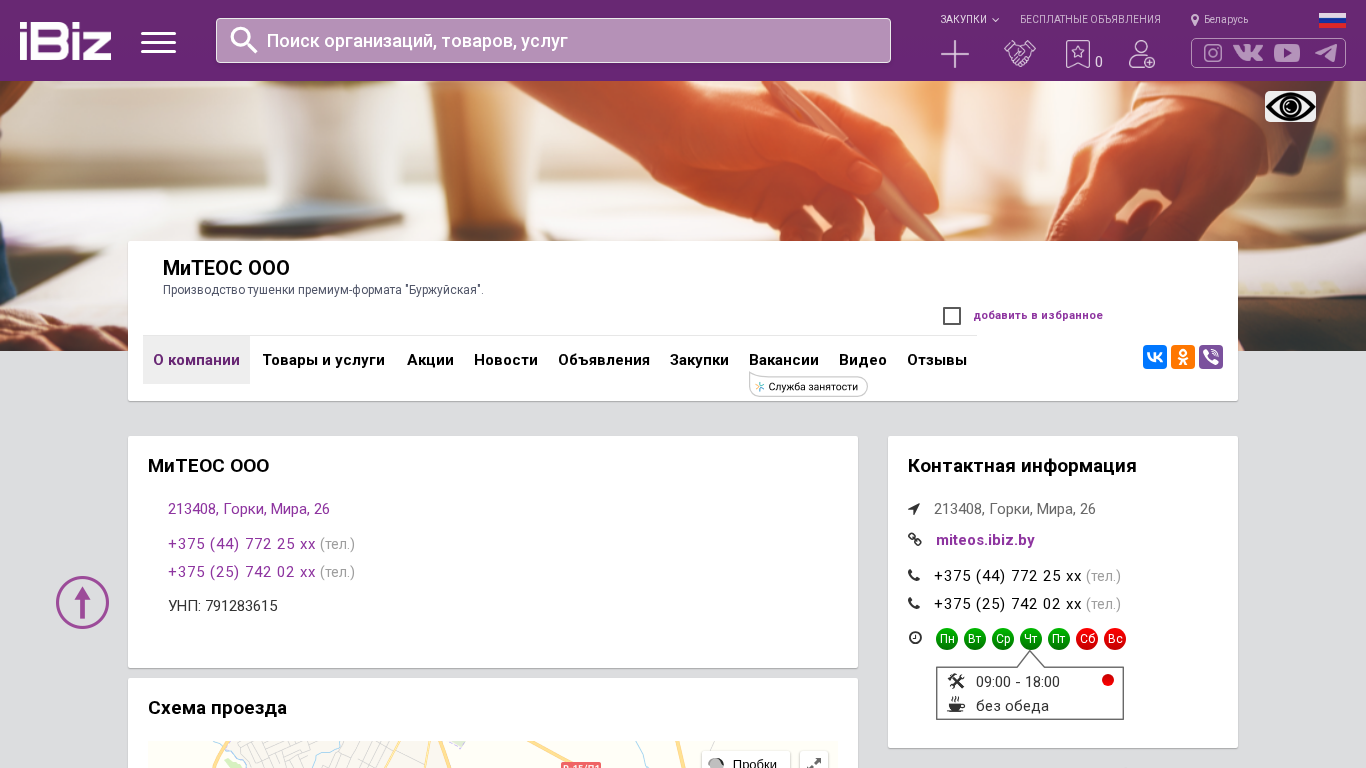 | Название / Заголовок | МиТЕОС ООО - Производство тушенки премиум-формата "Буржуйская".. 213408, Горки, , Мира, 26 |