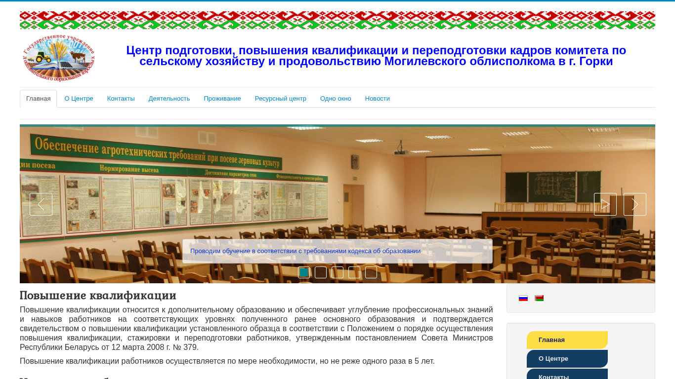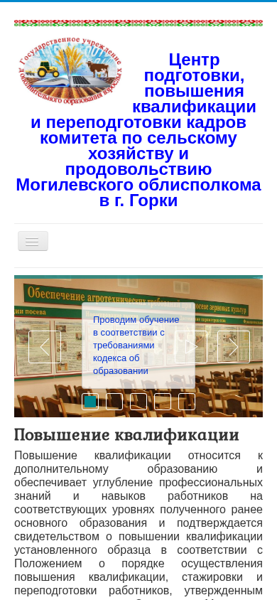 | AI-анализ | The website, titled "Главная" (Main), is the homepage of the Centre for Training, Qualification Enhancement and Professional Development of Staff in the Committee for Agriculture and Food of the Mogilev Oblast Executive Committee, located in the city of Gorki. The website provides information on the centre's goals, history, staff, leadership, equipment, teachers, contacts and various services offered. The main areas of activity include educational, publishing, consultancy and residential services. The centre offers training and education on computer programs and web resources, with a wide range of up-to-date recommendations. It also provides comfortable living conditions for its students. The centre's mission is to enhance the qualifications of its staff in accordance with the Code of Education, creating conditions for the study of computer programs and working with web resources. The centre extensively uses training simulators and real equipment in its educational |