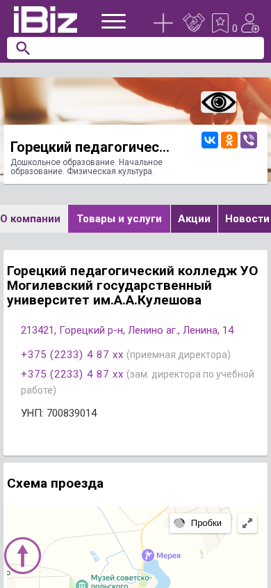 | AI-анализ | This website is for the "Goretsky Pedagogical College" of the "Mogilev State University named after A.A. Kuleshov" which offers preschool, primary and physical education. The address is given as "Lenino ag., Lenina, 14" in the city of Gorki, Belarus. The contact numbers provided are "+375 (2233) 4 87 xx (for the receptionist) and +375 (2233) 4 87 xx (for the deputy director of academic affairs)". The business registration number is "700839014". The website includes information about the college's offerings, contact details, and a map showing the location. The college operates from Monday to Friday, 9:00 AM to 6:00 PM without a |