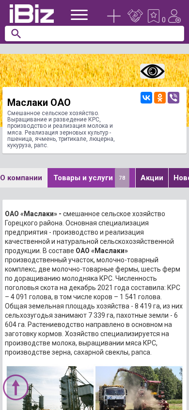 | Название / Заголовок | Маслаки ОАО - Смешанное сельское хозяйство. Выращивание и разведение КРС, производство и реализация молока и мяса. Реализация зерновых культур - пшеница, ячмень, тритикале, люцерна, кукуруза, рапс. . 213401, , Маслаки аг., Ленинская, 11 |