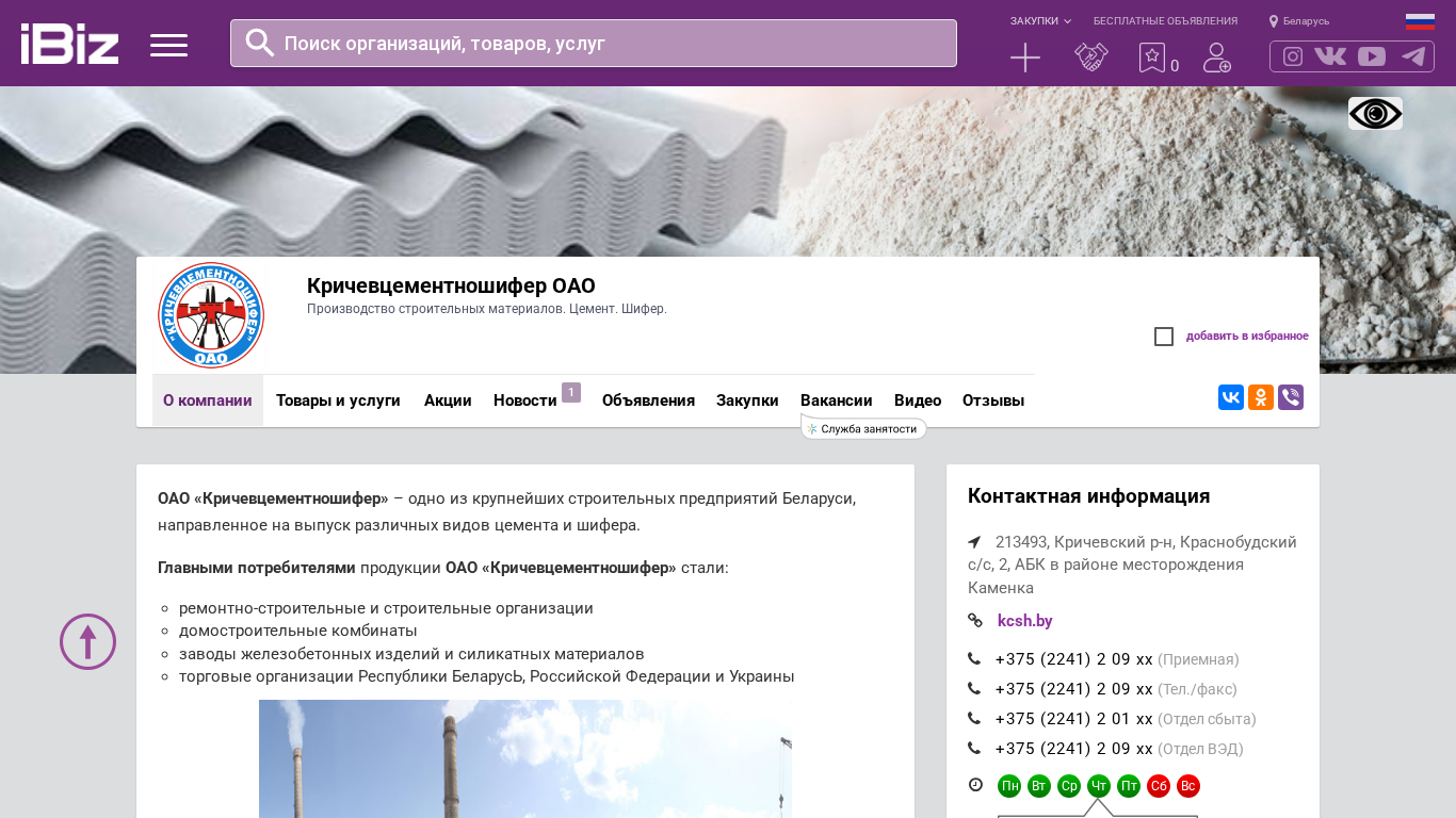 | Название / Заголовок | Кричевцементношифер ОАО - Производство строительных материалов. Цемент. Шифер.. 213493, , Краснобудский с/с, 2, АБК в районе месторождения Каменка |