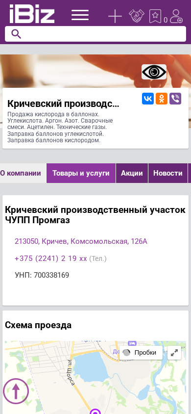 | Название / Заголовок | Кричевский производственный участок ЧУПП Промгаз - Продажа кислорода в баллонах. Углекислота. Аргон. Азот. Сварочные смеси. Ацетилен. Технические газы. Заправка баллонов углекислотой. Заправка баллонов кислородом.. 213050, Кричев, , Комсомольская, 126А |