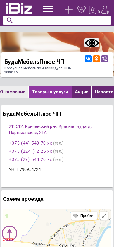 | AI-анализ | This online resource is dedicated to BudaMebelPlus CHP, a company that specializes in custom-made corpus furniture. The website provides information about the company's location, which is in the 213512 postal code area, specifically at Красная Буда д., Партизанская, 21А in Belarus. Users can find contact details for the company, including three phone numbers, and a map scheme for reaching the location. The website offers various sections, such as "О компании," "Товары и услуги," "Мебель," and "Акции," where visitors can learn more about the company's offerings, products, and promotions. Other features include a news section, a vacancies page, and a way to add the company to users' favorites. The company falls under the "Деревообработ |