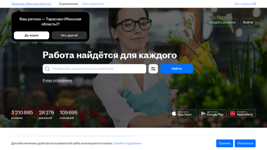 | AI-анализ | The web project tarasovo.rabota.by is a job listing platform specifically for the location Tarasovo in the Minskaya oblast, Belarus. It offers fresh job vacancies from local employers in various professional fields. Users can search for jobs and employers on the site. The site contains sections for 'Help', 'I'm looking for a job', 'Create resume', 'Log in', 'Link to experiment', and 'Terms of service'. It also features a captcha verification and a phone number input for employers to contact applicants. The site reportedly has 109,695 companies, 28,279 job vacancies, and 3,210,885 resumes. Some popular job categories include 'Rabota iz doma' (working from home), 'Podrabotka' (part-time work), and 'Kurier |