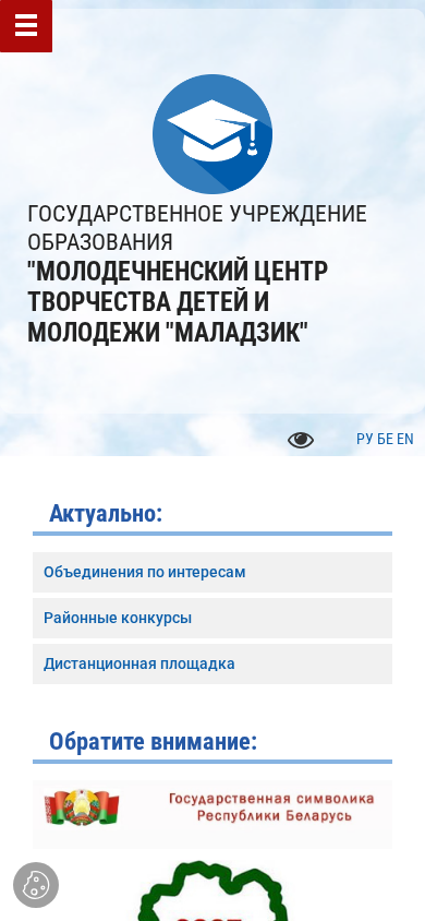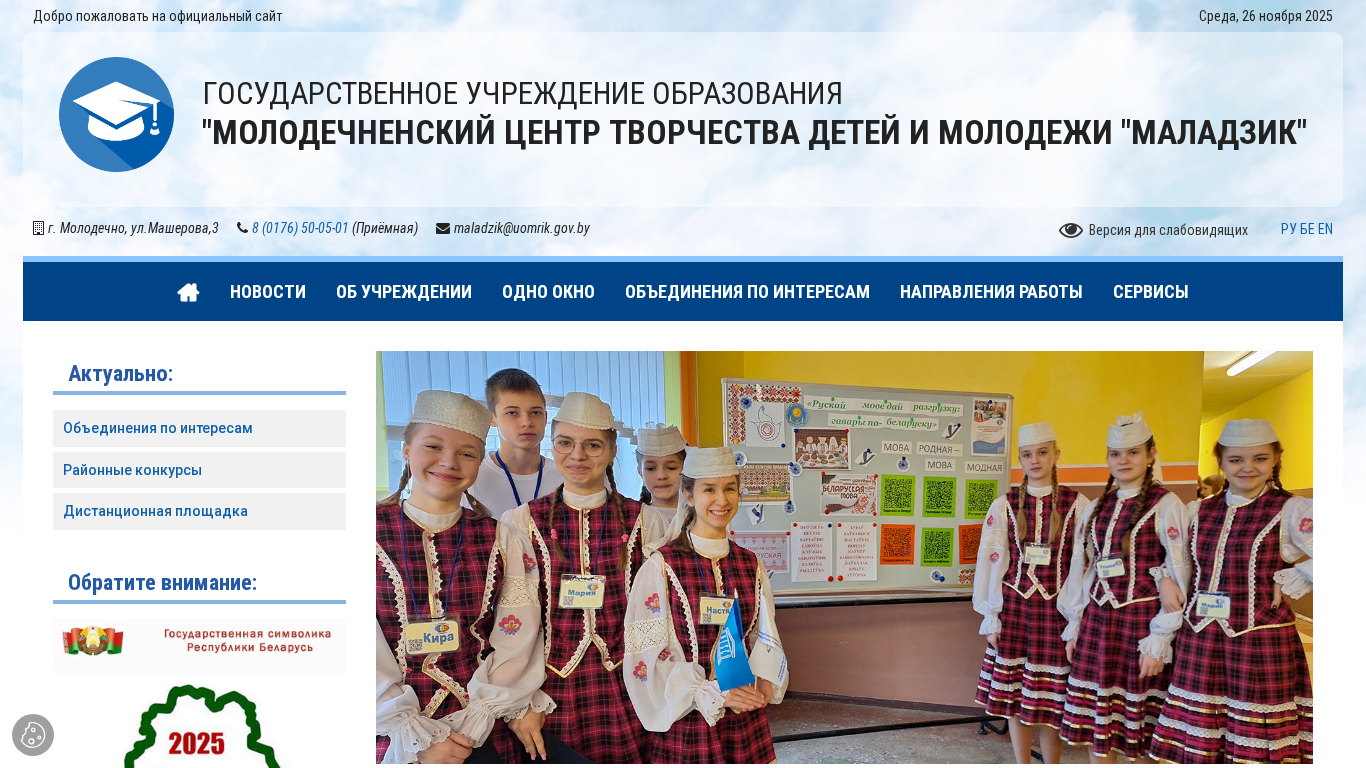 | AI-анализ | The web project "Молодечненский центр творчества детей и молодежи "Маладзик" (Maladzik Youth and Children Creativity Centre in Minsk, Belarus) is an official website for a state educational institution located in Minsk, Belarus, at ul. Masherova, 3. The centre provides various creative activities for children and youth. The website includes information about the centre, its goals and tasks, history, contacts, schedule, fees, and services. It also offers a map of the location, administrative procedures, and an electronic application form. The site contains various rubrics for social pedagogy, a union, a news section, and an interactive map. Users can find information about enrolling in different profile classes, such as technical, sports-technical, natural-mathematical, artistic, ecological-biological, tourist |