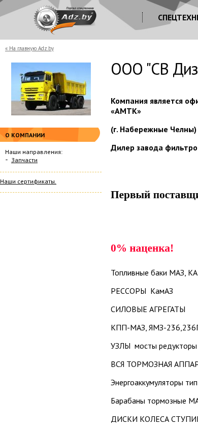 | AI-анализ | The website svdiselkama.adz.by is an official dealer for various truck and heavy machinery components, with a focus on parts for Kamaz and Maz vehicles. The company offers a wide range of products including filters, energy accumulators, turbochargers, and suspension components. They are the first supplier in Belarus for BelTiz and Efaton, and provide services such as repairs, rentals, and financing. The website contains an auto catalog for easy browsing and purchasing. The company's UNP number is 191505892 and their contact information includes several phone numbers and an email address. They are located in Minsk, Belarus, on Kazinets Street. |
