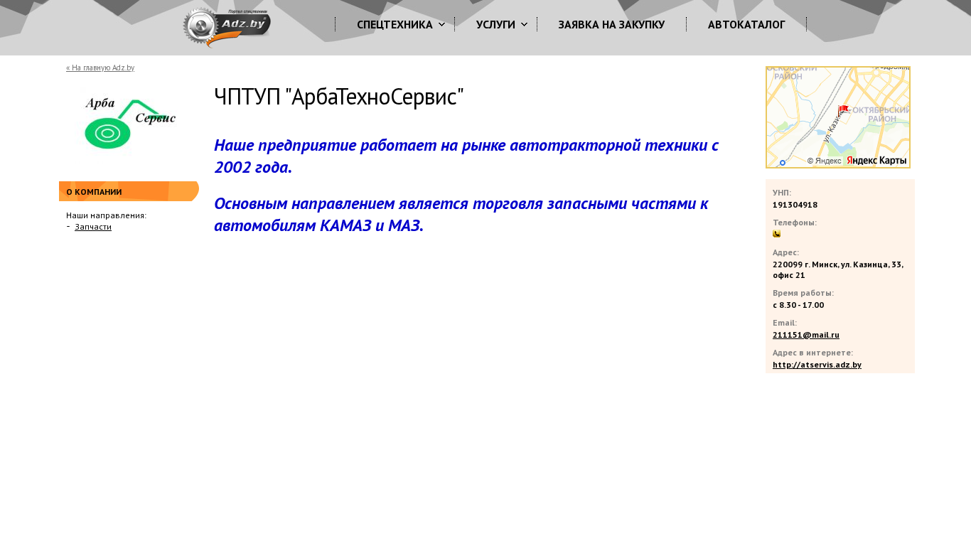 | Адрес | интернете:, http://atservis.adz.by, ЧПТУП "АрбаТехноСервис", Наше предприятие работает на рынке автотракторной техники с 2002 |