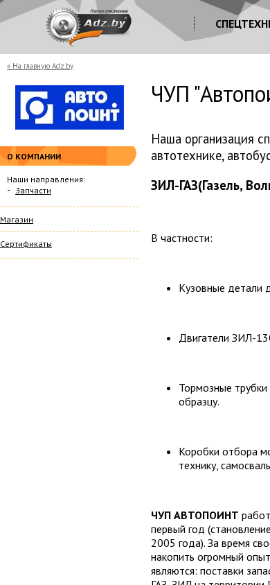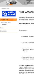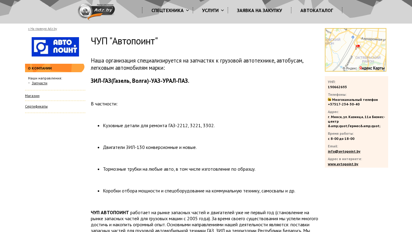 | AI-анализ | This website is for the Belarusian organization "Автопоинт" (AutoPoint) that specializes in spare parts for heavy commercial vehicles, buses, and light passenger cars, specifically for ZIL-Gaz (Gazelle, Volga), UAZ, URAL, and Paz. The company offers various services including equipment rental, repair, credit/leasing, and transportation services. It also provides a catalog and accepts purchase inquiries. The business, established in 2005, operates in Belarus and aims to make dealing with them convenient and cost-effective for customers by maintaining a large inventory of parts, quick and professional consultations, and efficient order processing. The company's contact information includes a multichannel phone number, email, and physical address in Minsk. The website's address is avtopoint.adz.by. |