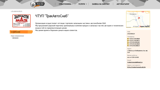 | AI-анализ | The portal "ЧТУП "ТракАвтоСнаб" is a specialized online marketplace offering a wide range of original spare parts and components for MAZ automobiles. With a focus on efficiency and cost savings for clients, the platform provides an extensive catalog of authentic parts, tires, and technical fluids at competitive prices. The organization's contact information includes several phone numbers and an email address, along with a physical address in Minsk, Belarus. Regular business hours are Monday through Friday from 8:30 AM to 6:00 PM. The website is operated by Adz.by. |