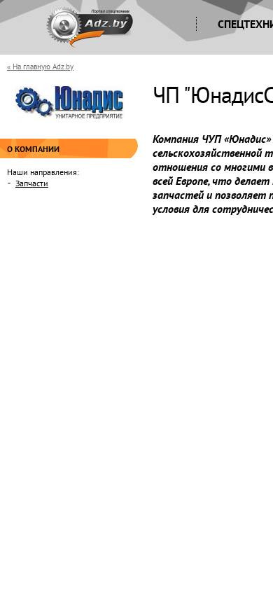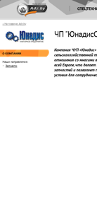 | AI-анализ | This online resource, titled "ЧП "ЮнадисСнаб" (JSC "YunadisSnab"), is a Belarusian business specializing in the sale of spare parts for foreign agricultural machinery. With over 8 years of experience, the company has established relationships with leading agricultural equipment manufacturers in Europe, enabling it to offer competitive pricing on the Belarusian market. The website provides information about the company's offerings, which include spare parts, services, rentals, repair, credit/leasing, transportation, and the ability to submit a purchase request. The company, known as ЧУП "Юнадис" (JSC "Yunadis"), can be contacted via telephone at +375 17 2919369 or +375 17 291 07 78, or by email at un |