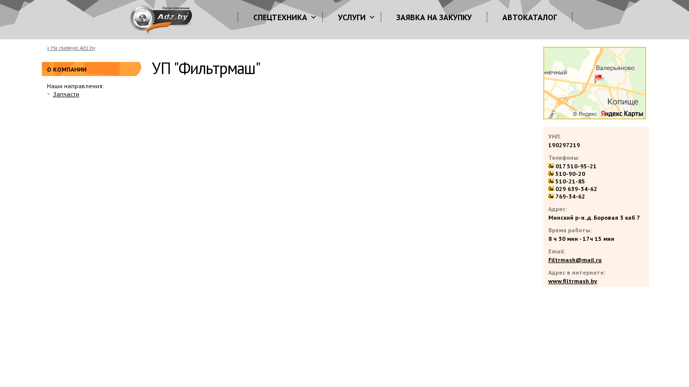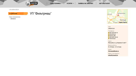 | AI-анализ | The website "УП "Фильтрмаш" (Filtrmash.by) is a business platform offering various services and products related to special technology, machinery, equipment, and spare parts. The website's title and description contain keywords such as 'спецтехника' (special technology), 'техника' (machinery), 'оборудование' (equipment), 'запчасти' (spare parts), 'услуги' (services), 'аренда' (rent), 'ремонт' (repair), 'кредит' (credit), 'лизинг' (leasing), and 'грузоперевозки' (cargo transportation). The company also provides a request form for 'заявка на закупку' (purchase request) and an 'автокаталог' (auto |