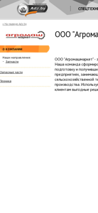 | AI-анализ | The website "ООО «Агромашмаркет»" is a young and rapidly developing Belarusian company specializing in the sale of agricultural machinery, equipment, and spare parts. The team is composed of experienced professionals who have undergone extensive training and gained their qualifications working for leading companies involved in the supply of foreign-made agricultural machinery and spare parts to Belarus. The website offers competitive solutions to its clients. The company's main directions include spare parts, agricultural machinery, and equipment. The UNP number is 191500691. The contact numbers are +375 17 269 92 94 (fax), +375 44 719 65 78, and +375 29 653 79 23. The email address is |