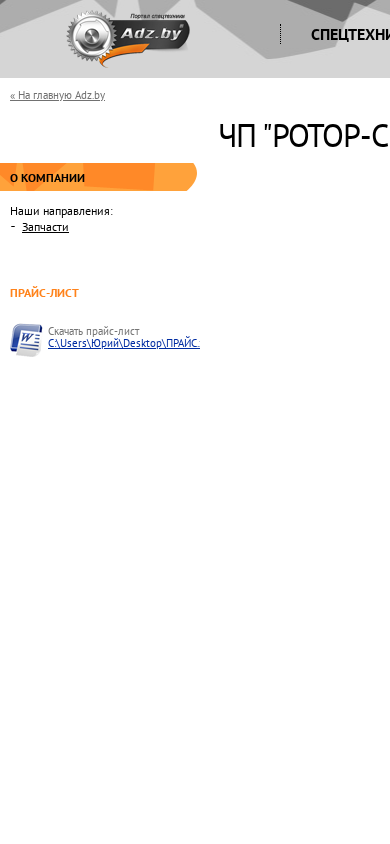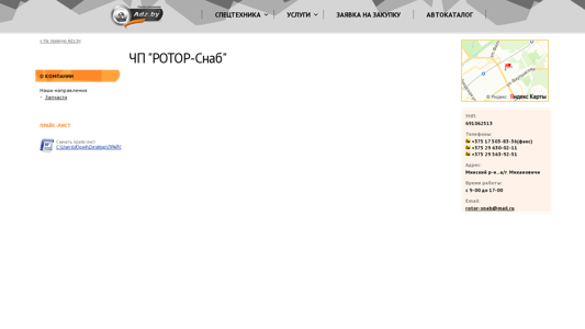 | AI-анализ | language: ru This online resource, titled "ЧП "РОТОР-Снаб", offers a range of services and products related to special technology, machinery, equipment, and spare parts. The key topics covered on the website include repairs, rentals, credits/leasing, transportation services, and a request for purchase. The company's Unified State Register number is 691062513. Users can contact the company via telephone at +375 17 503-83-36 (fax), +375 29 630-02-11, or +375 29 563-92-51. The company's address is in the Michanovichi agricultural cooperative in the Minsk region. The business operates from 9:00 AM to |