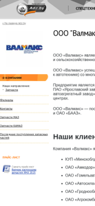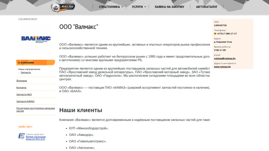 | AI-анализ | This website is for OOO "Валмакс," a company specializing in equipment, machinery, and spare parts sales, services, rental, repair, credit/leasing, and cargo transportation. The company has been active on the Belarusian market since 1995 and maintains long-term business relationships with numerous major Belarusian enterprises for supplying automotive and agricultural machinery parts. OOO "Валмакс" is a significant supplier of parts for KAMAZ, MАZ, Kirivets tractors, JSC Yaroslavsky Diesel Engine Plant, JSC Yaroslavsky Motor Plant, ZAO Tutayev Motor Plant, OAO Shadrinsky Automotive Plant, OAO Gidrosila, and other prominent manufacturers. The company operates warehouses in all major Belarusian regional centers and large townships. OOO " |