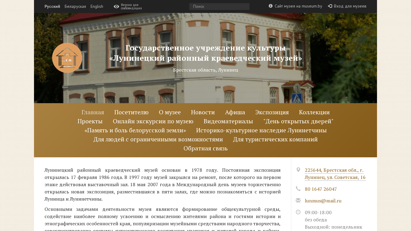 SEO-описаниеГосударственное учреждение культуры «Лунинецкий районный краеведческий музей» — новости и афиша мероприятий, информация для посетителей, цены, экспозиция, коллекции, материалы для музейщиков.