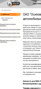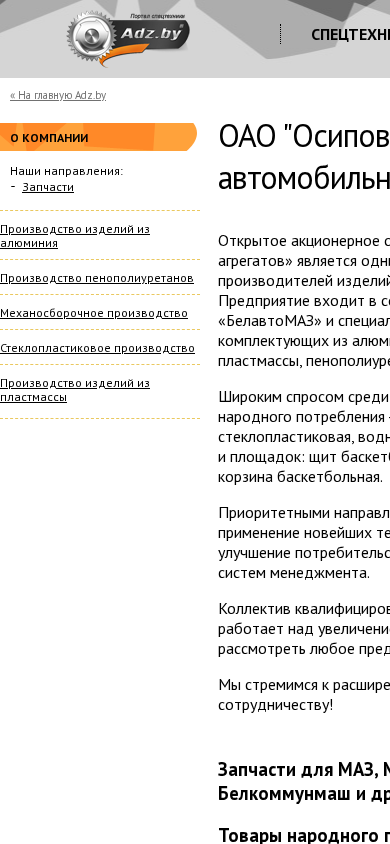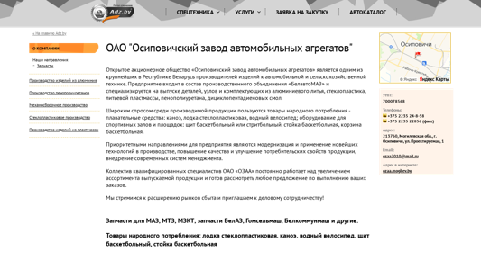 | AI-анализ | The website is for ОАО "Осиповичский завод автомобильных агрегатов" (Osiповичский automobile components factory). It is a significant producer of components for automobile and agricultural technology in Belarus, part of the BelavtoMAZ production association. The company specializes in manufacturing parts, units, and components from aluminum casting, glass plastic, injection-molded plastics, and polyurethane foam. Popular consumer goods among their products include sporting equipment such as basketball hoops, goals, and nets, and watercraft like glass fiber boats and water bicycles. The business focuses on modernizing production techniques, improving product quality, and implementing advanced management systems. The team of qualified specialists is constantly expanding their product line and welcomes inquiries for custom orders. Their offerings include parts for MАZ, MТZ, МЗ |