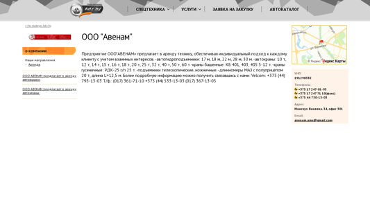| AI-анализ | The web project OOO "Авенам" is a Belarusian business offering equipment and services for rent, including cranes, trucks, and spare parts. The company specializes in providing individual solutions to clients, addressing mutual interests. They offer a wide range of cranes, such as those with lifting capacities from 10 to 60 tons, as well as telescopic and boom cranes. Additionally, they provide trucks for transportation needs and offer repair and maintenance services. The company can be contacted via phone numbers +375 17 247-01-95 and +375 17 247 71 10 (fax), or by email at avenam.ams@gmail.com. Their address is listed as Минскул. Ванеева, 34, офис 301. |