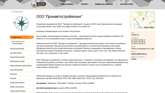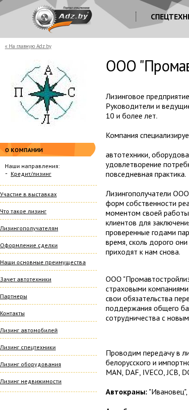 | AI-анализ | This online resource is the official website of ООО "Промавтостройлизинг," a Belarusian company specializing in leasing of special equipment, vehicles, and machinery. The website provides information on the company's services, which include renting, repair, and credit/leasing options for various industries. The site also features a catalog of available equipment and vehicles, as well as contact information for the company. Keywords associated with the site include "лизинг" (leasing), "ооо" (LLC), "промавтостройлизинг," "37517," and various terms related to special equipment, credit, and automotive technology. The company was established in 2005 and has a team of experienced professionals with over 10 years of experience in the leasing industry. OОО "Промавтостройли |
